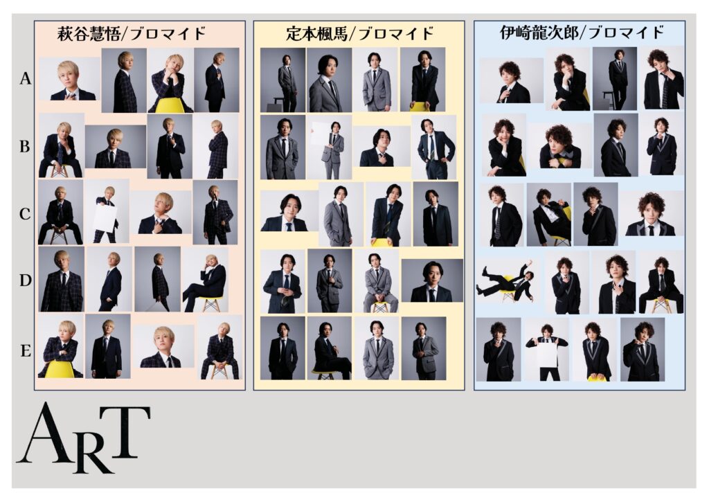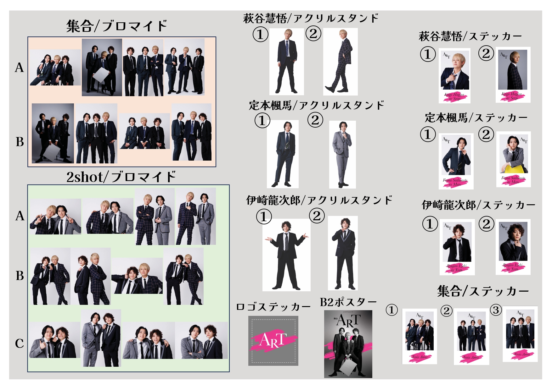 各18,000円内容:パンフレット / B2ポスター / ブロマイド (個人5種. 3shot2種. 2shot2種) / アクリルスタンド2種 / チェキ風ステッカー (個人2種. 3shot3種) + ロゴステッカープレゼント!